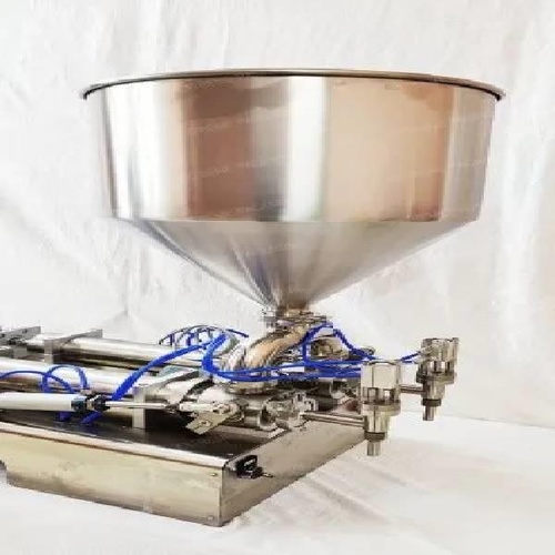 Stainless steel semi-automatic paste filler machine, made in India. Operates at 30 bottles per minute with 1 HP power consumption and 60 Hz frequency.