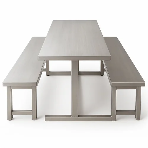 Durable stainless steel table and bench set designed for 6-seater capacity. Robust construction for long-lasting use. Material: Stainless Steel.