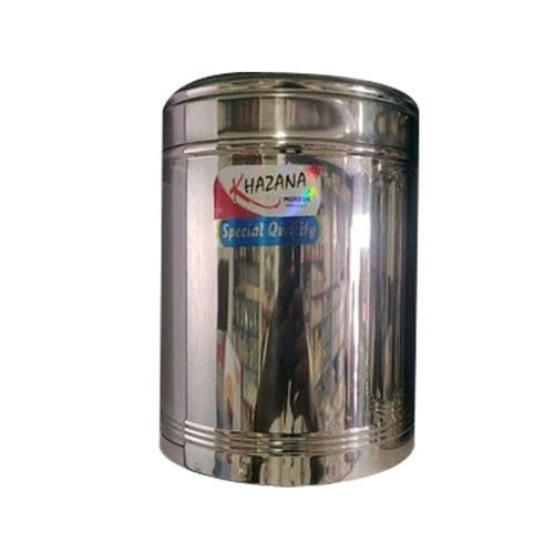 Round stainless steel tea container, SS202 grade, 15-20 kg capacity. Features a mirror finish, suitable for home use.