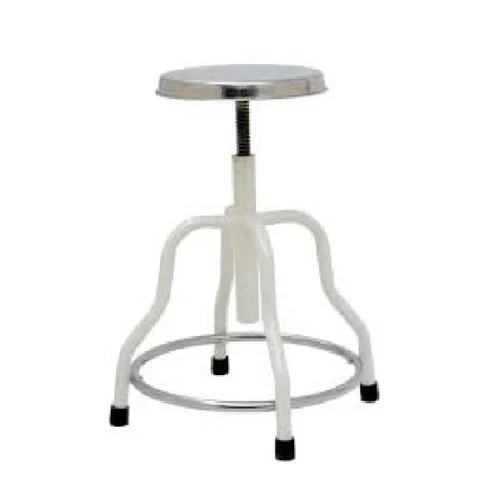 Adjustable height revolving stool with a durable stainless steel top and robust frame. Ideal for various medical and laboratory environments requiring easy mobility.