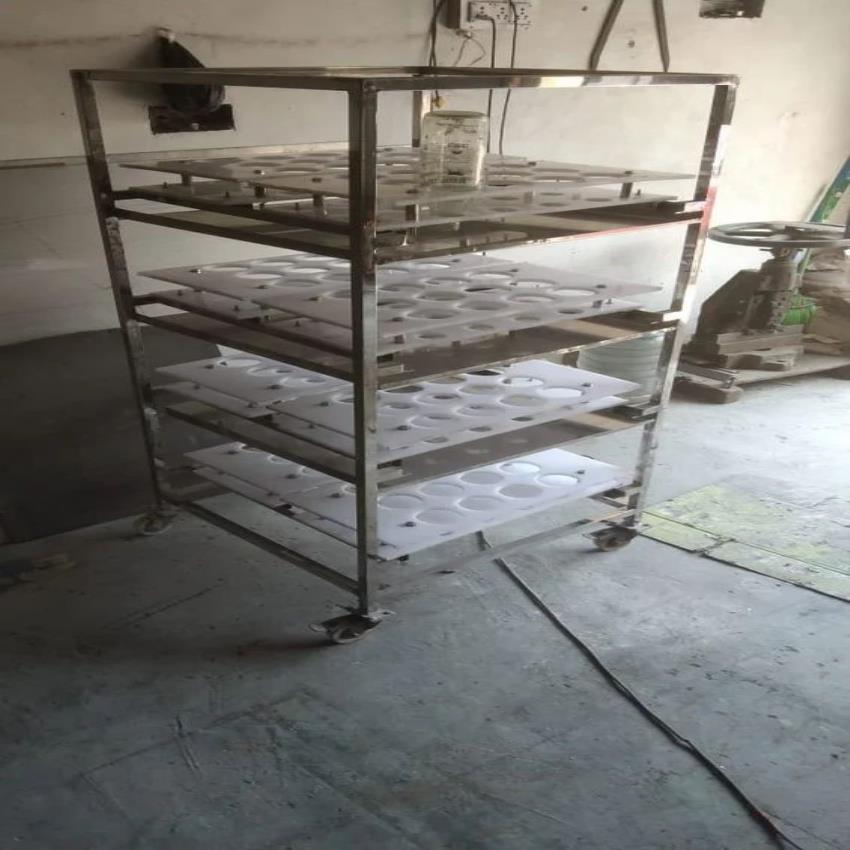 Industrial stainless steel trolley with a 50kg capacity. Features a silver, color-coated finish. Designed for rectangular bottle transport, packaged in a box. Made in India.