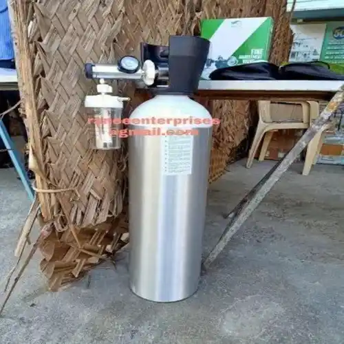 Standard medical oxygen gas cylinder for essential medical use. Reliable and durable construction. Designed for safe and efficient oxygen delivery. Essential medical equipment.