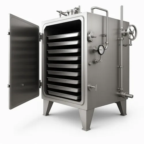 Steam-heated vacuum shelf tray dryer. Production capacity 10KG to 2000KG. Delivered in a wooden box from Delhi, India. Lead time 2-3 weeks.