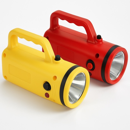 Yellow and red ABS plastic solar torch with 6-hour battery backup. Features 2-stage dimming, 120-240V AC charging, and a 3W solar panel.