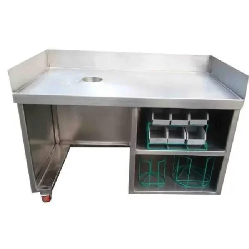 Rectangular stainless steel counter table for commercial use. Features two shelves and a powder-coated surface finishing. Supports up to 100 kg weight tolerance. Silver color, 4x5 ft dimensions.