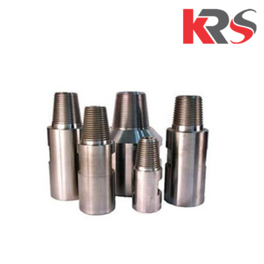 Steel drill rod adapters with EN 8 material grade. Available in 2 7/8", 3 1/2", and 4 1/2" sizes with API straight and taper threads.