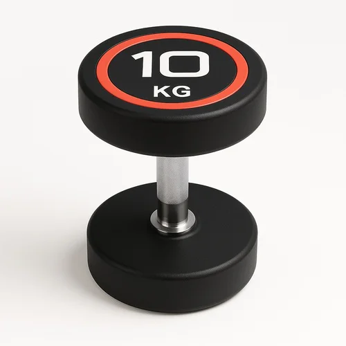 Round head steel gym dumbbell weighing 10 kg. Features a black finish for durability and a secure grip during workouts.
