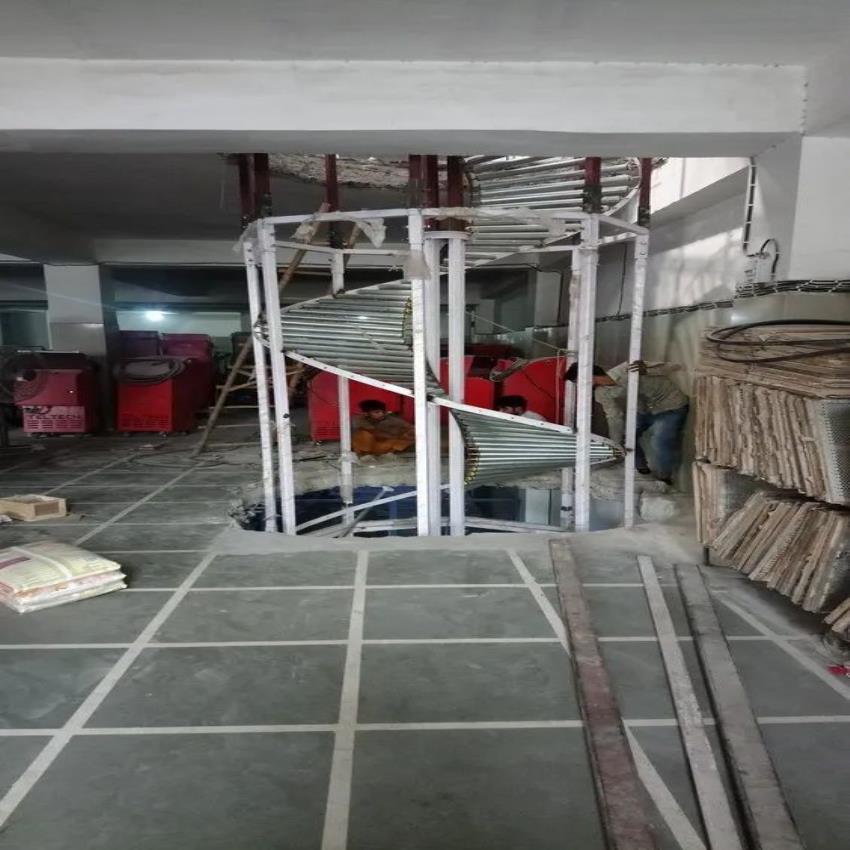This steel spiral conveyor machine handles materials up to 150 Kg/Feet, with a 400mm belt width. It operates at 120 m/min conveying speed, 10 Mtrs height, and 380V, three-phase power.