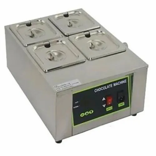 This steel chocolate warmer machine for restaurants has an 8 Kg capacity and 1 KW power, operating between 0-80 C. Machine size: 485x360x180 mm.