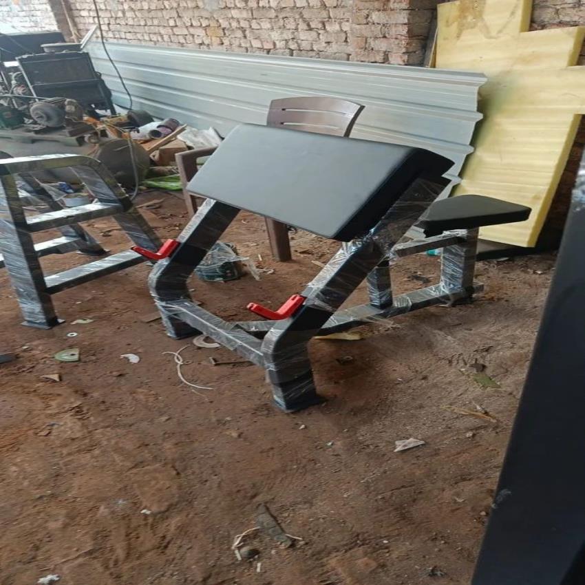 Steel standing preacher curl bench with color-coated finish, designed for commercial gym use. Supports up to 200 KG user weight, suitable for back and bicep exercises.