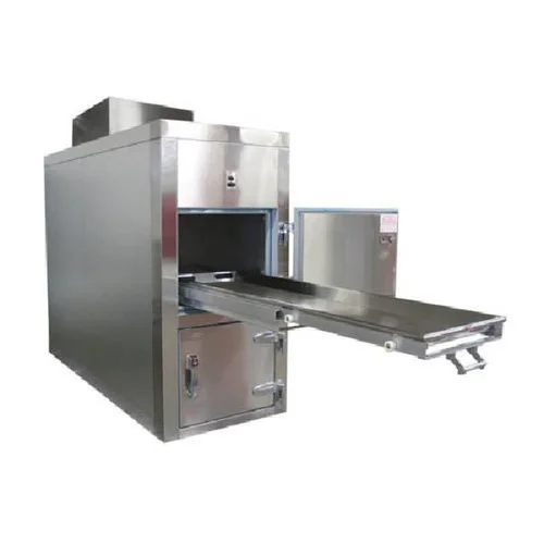 Stericox mortuary cabinet with digital PID controller displaying SV & PV. Features a 2°C to 8°C temperature range, powder-coated GI external cabinet, and stainless steel 304 inner construction.