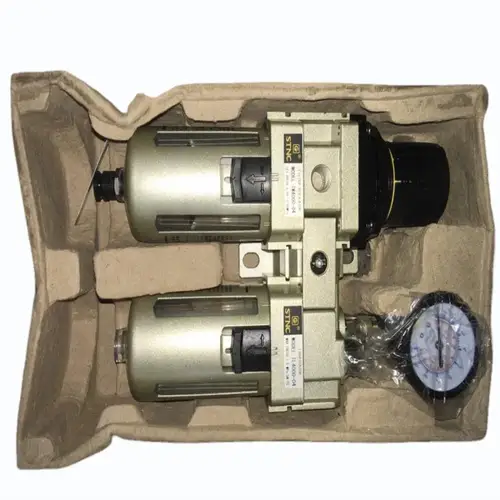 STNC Pneumatic Air Line FRL Equipment. Features 1/2 inch port size, 10 bar pressure range, and 10 KG operating pressure. Golden color, 1/8 inch size, suitable for air line combinations.