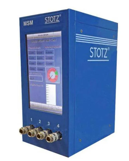 Blue Stotz electronic air gauge, model MSM, for pressure measurement. Features 220V electric power, USB connectivity, and a color touchscreen with digital I/O and Ethernet TCP/IP interfaces.