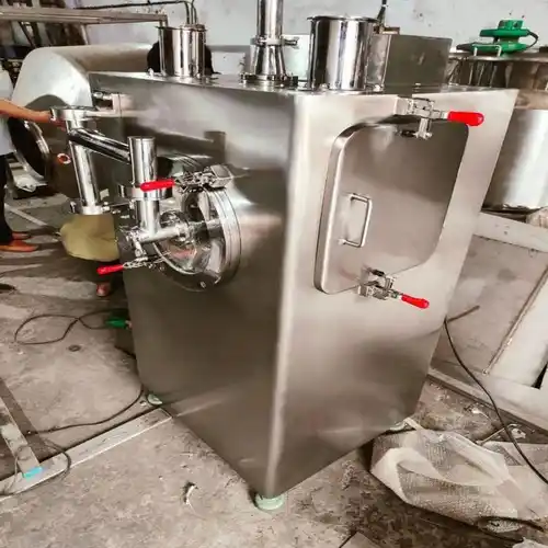 Stainless steel tablet coating machine with polished finish. Operates on 414 V, 3 phase, 60 Hz power supply. Designed for pharmaceutical industries.