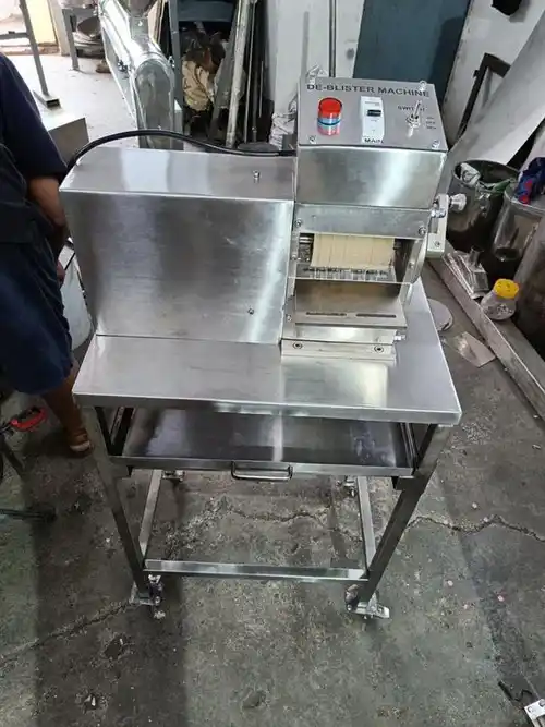 Semi-automatic stainless steel tablet deblistering machine. Operates on 3-phase, 415V power with a 120 piece/min capacity, packaged in a wooden box.