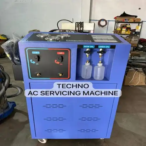 AC servicing machine with 500g/min charge and recovery speed. Features 10/20kg cylinder capacity, four-stage filtration, 5g scale resolution, and 30hg vacuum speed.