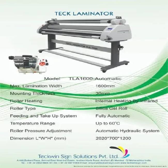 The Teckwin Electronic Laminator TLA1600 offers a 1600mm max width, 30mm mounting thickness, and up to 60°C internal infrared heating. Features automatic hydraulic pressure adjustment.