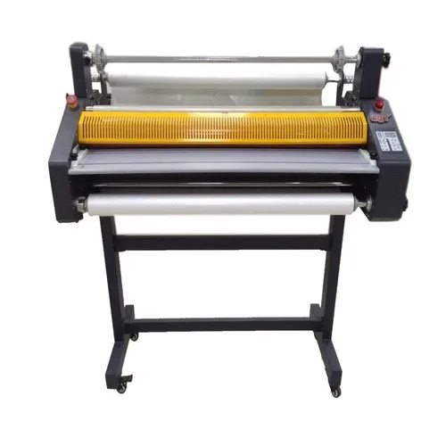Features rubber roller for thermal lamination. Offers 1050mm max width, 60-160°C temp range, and 3 mtr/min speed. Includes stand. Suitable for 42-inch paper.