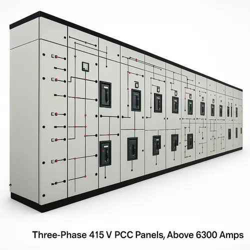 Three-phase 415V PCC panel, automatic grade, rated for currents above 6300 Amps. Constructed from MS for robust industrial use. Ensures efficient power control and distribution.
