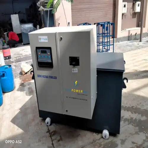 Three phase AC industrial servo voltage stabilizer with 1200A current capacity. Made in India, customizable options available. Ideal for voltage control applications.