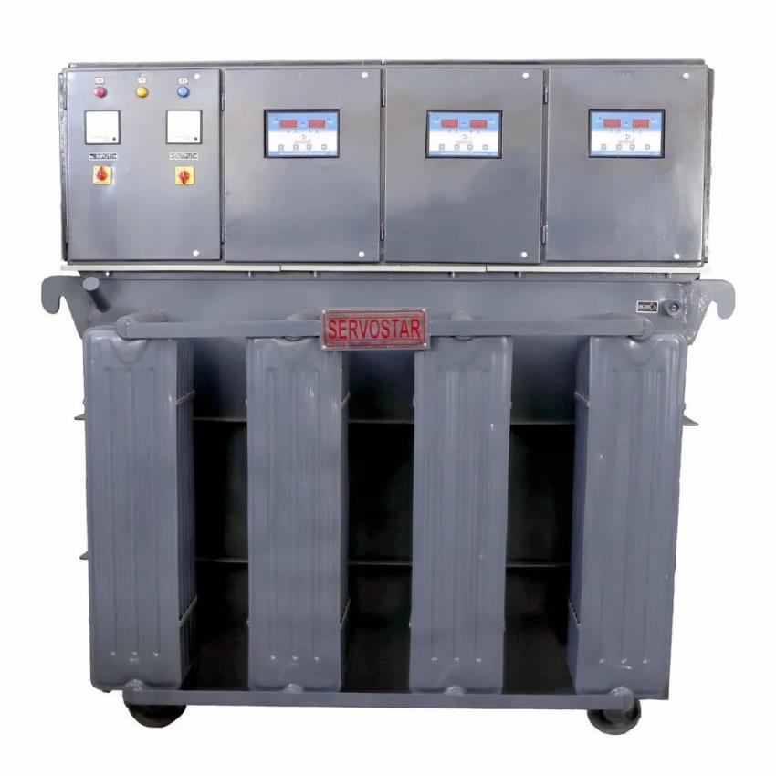 ISO Certified, semi-automatic, three-phase industrial voltage stabilizer. Features oil cooling and over-voltage protection. New condition, manufactured in India. Available for online payment and shipping.