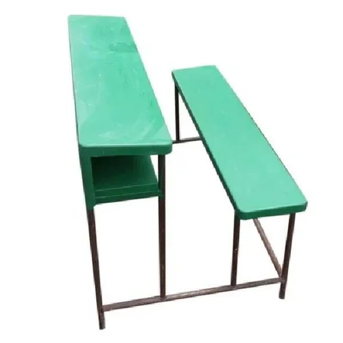 Rectangular FRP school bench, 5 ft length, in green. Features a modern design without backrest or armrest, accommodating three seated students for school use.