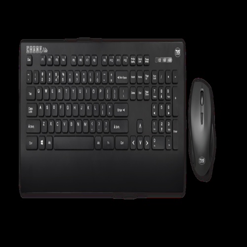 Wireless 2.4G RF combo with 103-key keyboard (ABS) and 1600 dpi mouse. Features multimedia keys, laser etching, and 10m range.