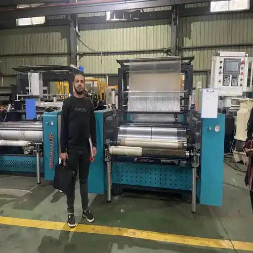 Semi-automatic two-layer air bubble film making machine for shopping bags. Operates on 440v, 45-50 kg capacity, and consumes 108.5 - 178.5 kw. Available in blue/white.