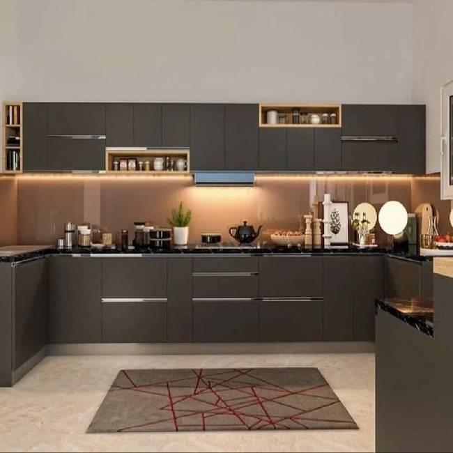Modern U-shaped modular kitchen with wooden material. Services include wood work and furniture installation for a complete kitchen solution.