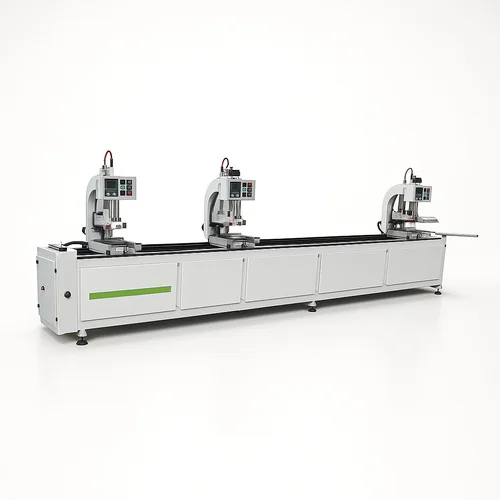 Semi-automatic UPVC three-head welding machine, 220V/50Hz, 3.5kW. Welds UPVC profiles with 0.4-0.6 Mpa pneumatic pressure and 20-120mm welding area.