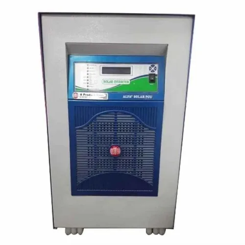 UTL Alfa Plus 10kVA PCU with solar battery charging. Features battery low cut, IT load compatibility, and no load shut down. Can operate independently without solar power.
