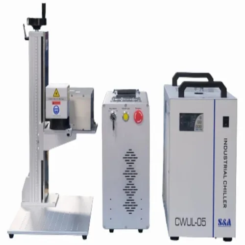 Semi-automatic UV laser marking machine, 5W laser power, 355 nm wavelength, 230V single phase, 10000 mm/s speed, 300mm x 300mm marking area, water cooled.