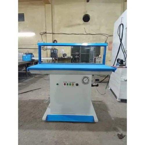 MS vacuum pressing table with built-in boiler. Suitable for ironing clothes. Features suction motor. White and blue color, overall dimensions 48" X 30" X 32".