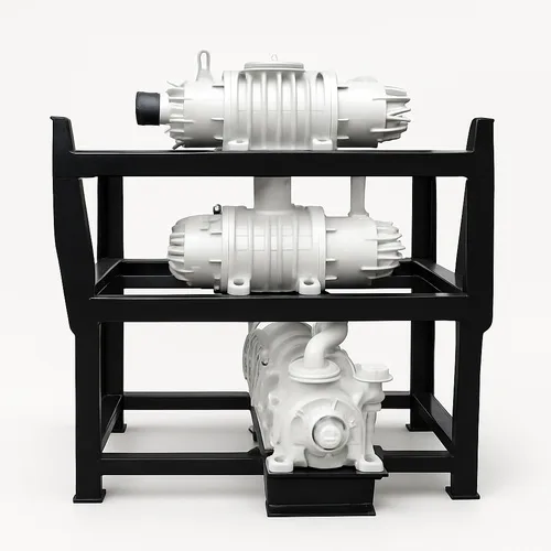 Mild steel vacuum system combining a vacuum booster and two-stage watering pump. 220V, 1000 LPM max flow rate, 100kg weight. Made in India.