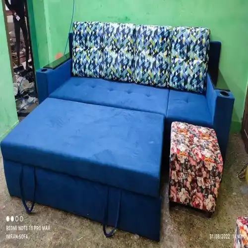 Blue wooden frame sofa-bed with pull-out conversion, suitable for living rooms. Velvet seat material and rectangular shape. Converts to a double bed, mattress not included.