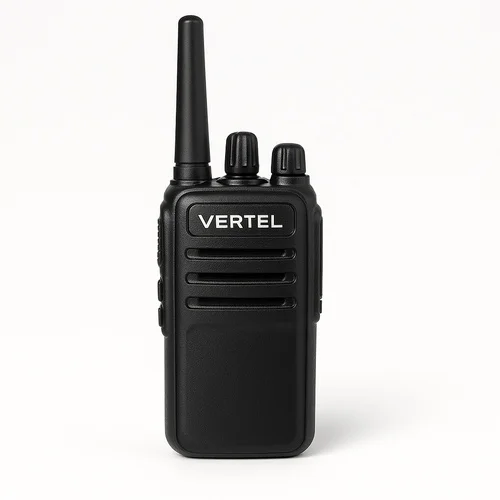Vertel license-free walkie talkie with LED display. Features up to 99 channels and a range of up to 1 km. Minimum order quantity of 2 pieces.