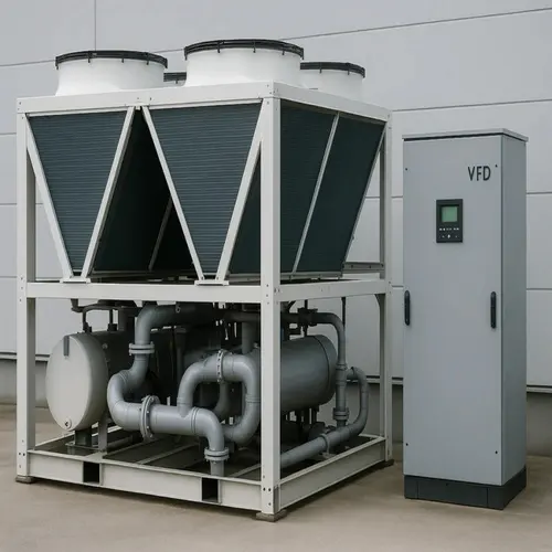 Variable Frequency Drive Chiller with 3 Phase input, 50/60 Hz. Features Vector Control, 150% start-up torque at 0.5 Hz, and adjustable acceleration from 0.1-600 seconds.