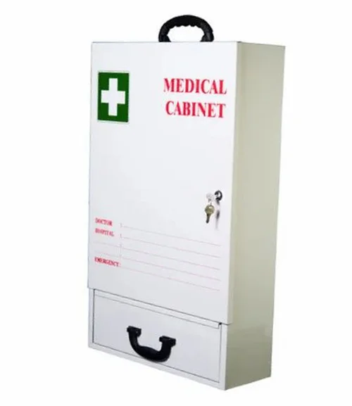 Metal medical cabinet designed for wall mounting. Provides secure storage solution for medical facilities. Durable construction ensures longevity in clinical environments.