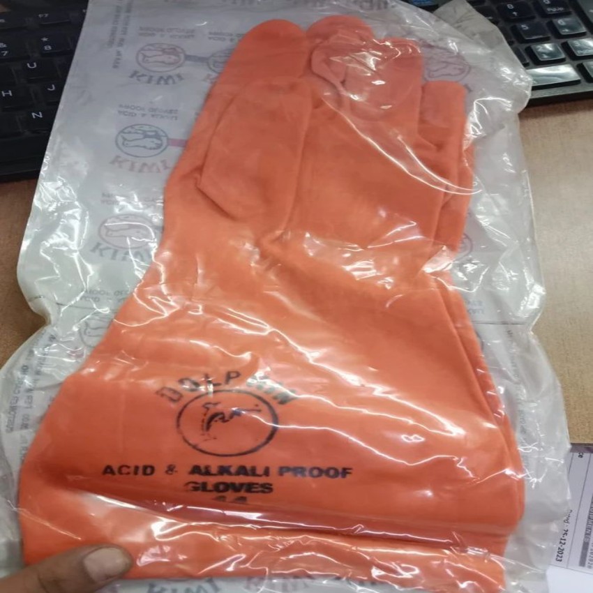 Orange rubber household gloves with a printed pattern. Cuff length 11-15 inches, washable and reusable. Ideal for various domestic cleaning tasks.
