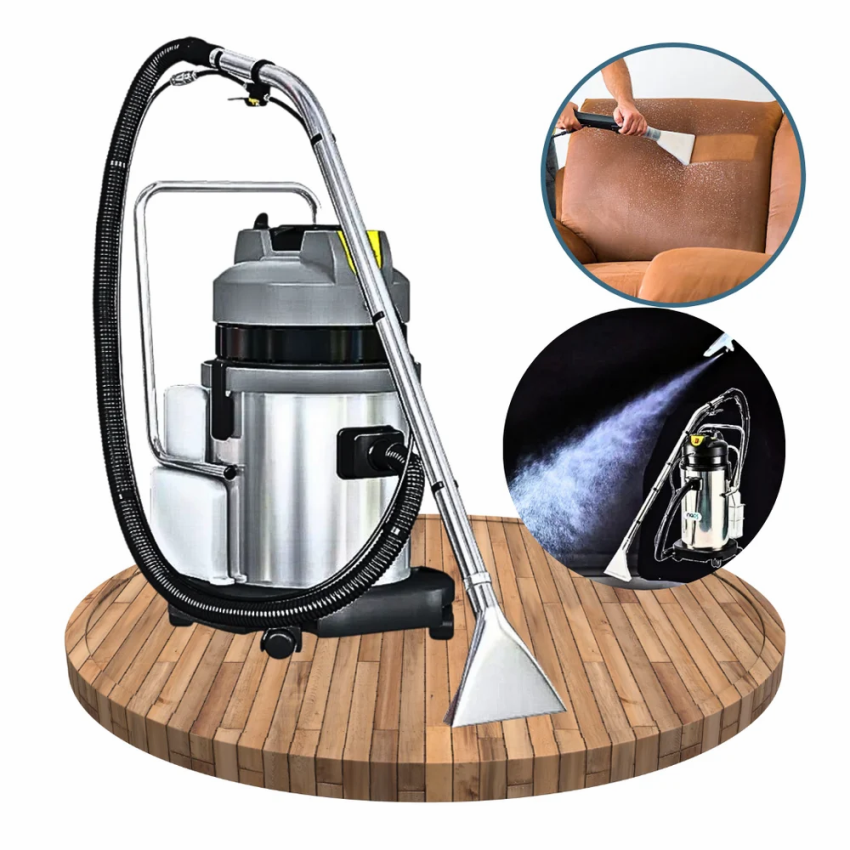 1000W double stage Italian motor wet/dry vacuum with 40L dirty water tank and 10L shampoo tank. Offers 260W suction, 40W pump, and >53 lps airflow for cleaning sofas, carpets, and mattresses.
