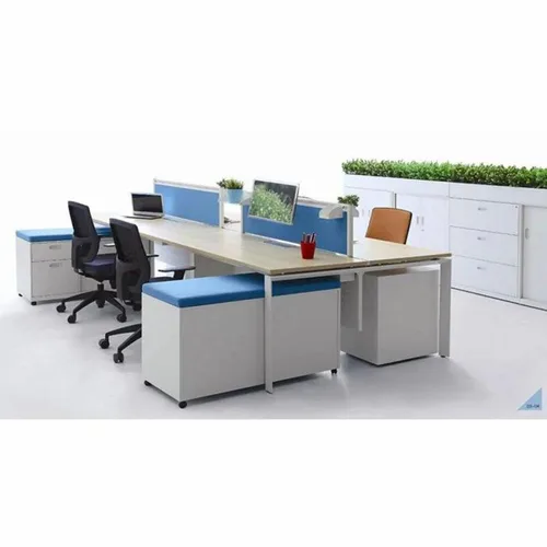 Single-seater white workstation with a long pedestal. Wooden construction with an aluminum frame. Features glossy/matt finish and eco-friendly properties. Table shape: Rectangle.