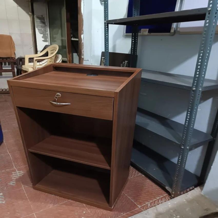 White polished wood podium stand, 4 feet tall. Features a flat reading table. Suitable for college events and lectures. Made in India.