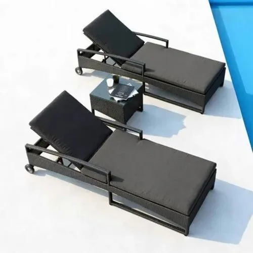 Durable wicker beach lounger in black. Features a square table. Ideal for beachside relaxation. Provides comfortable seating and a convenient surface.