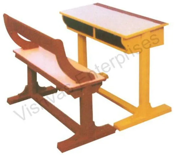 Designer 2-seater classroom table and bench set. Constructed with wood and iron. Available in various colors. Features 2 drawers. Suitable for sitting.