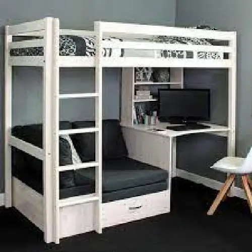 Durable wooden bunk bed designed for space efficiency. Features an integrated study table, offering a functional solution for bedrooms. Suitable for various age groups.