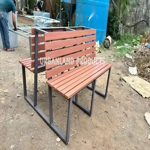 Indoor and outdoor suitable double wooden bench with integrated backrest. Features a polished surface finish. Currently available in stock for immediate purchase.