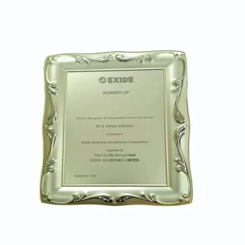 Rectangular wooden award, 14-inch size, brown and golden color. Ideal for Exide Business Excellence Competition applications in offices. Available in stock.