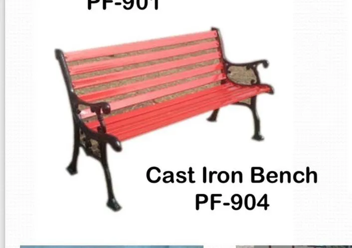 Modern wooden and mild steel garden bench, 3-seater, rectangular shape, red color. Suitable for home outdoor use.