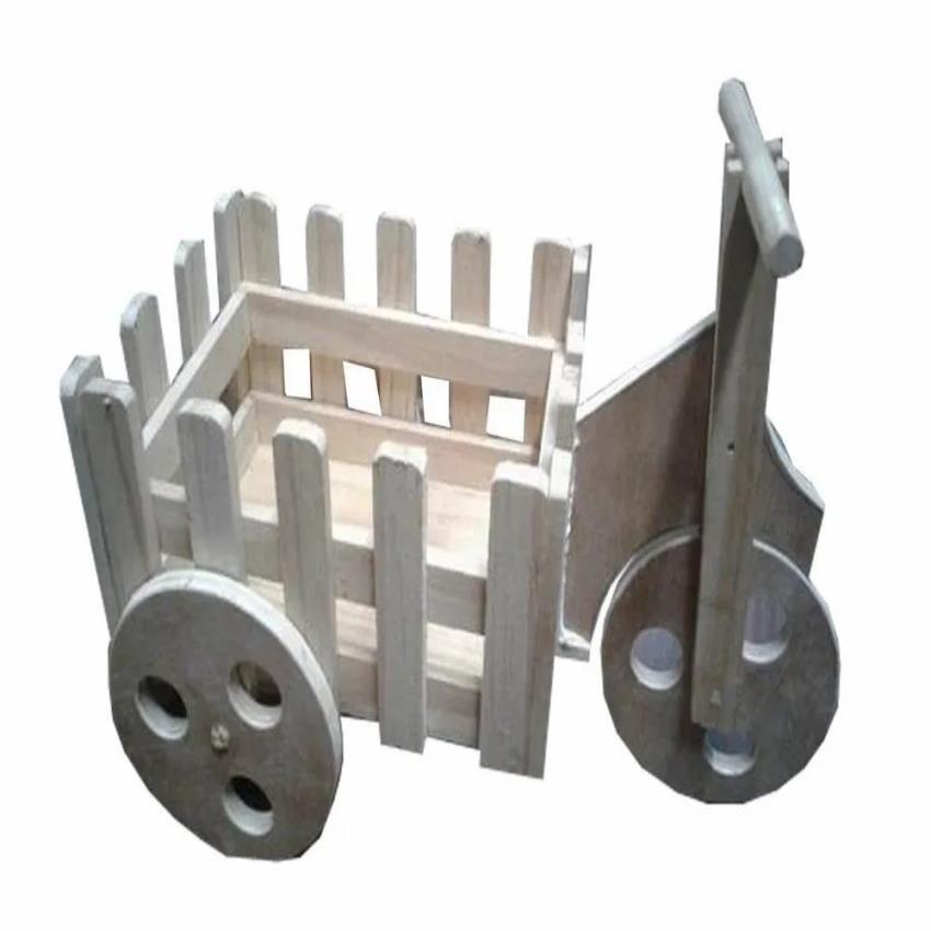 Brown wooden planter pot, 8"x5"x4" dimensions. Unique three-wheeler cycle shape with natural wood texture. Minimum order quantity of 24 pieces.
