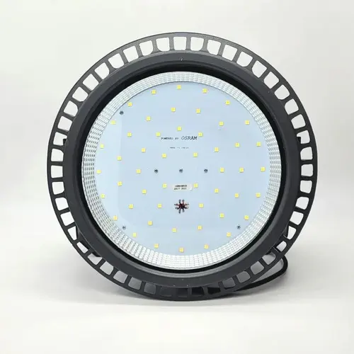 Durable 200W industrial highbay LED light. Features IP66 rating, aluminium body, and 5000-6500K cool white light. Operates on 110V-270V input voltage. CE, RoHS, NABL certified.